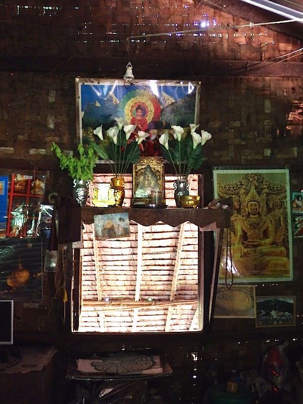 Quelques images publicitaires sur les murs, autres icônes assez incongrues, font face à l’autel du bouddha et les offrandes.