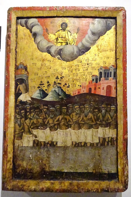Ce groupe de soldats fut condamné à mourir gelé sur la glace; un fuyard (à gauche) cuira dans une étuve et un soldat de garde le remplace pour que le nombre des martyrs coïncide avec les couronnes qui les attendent.